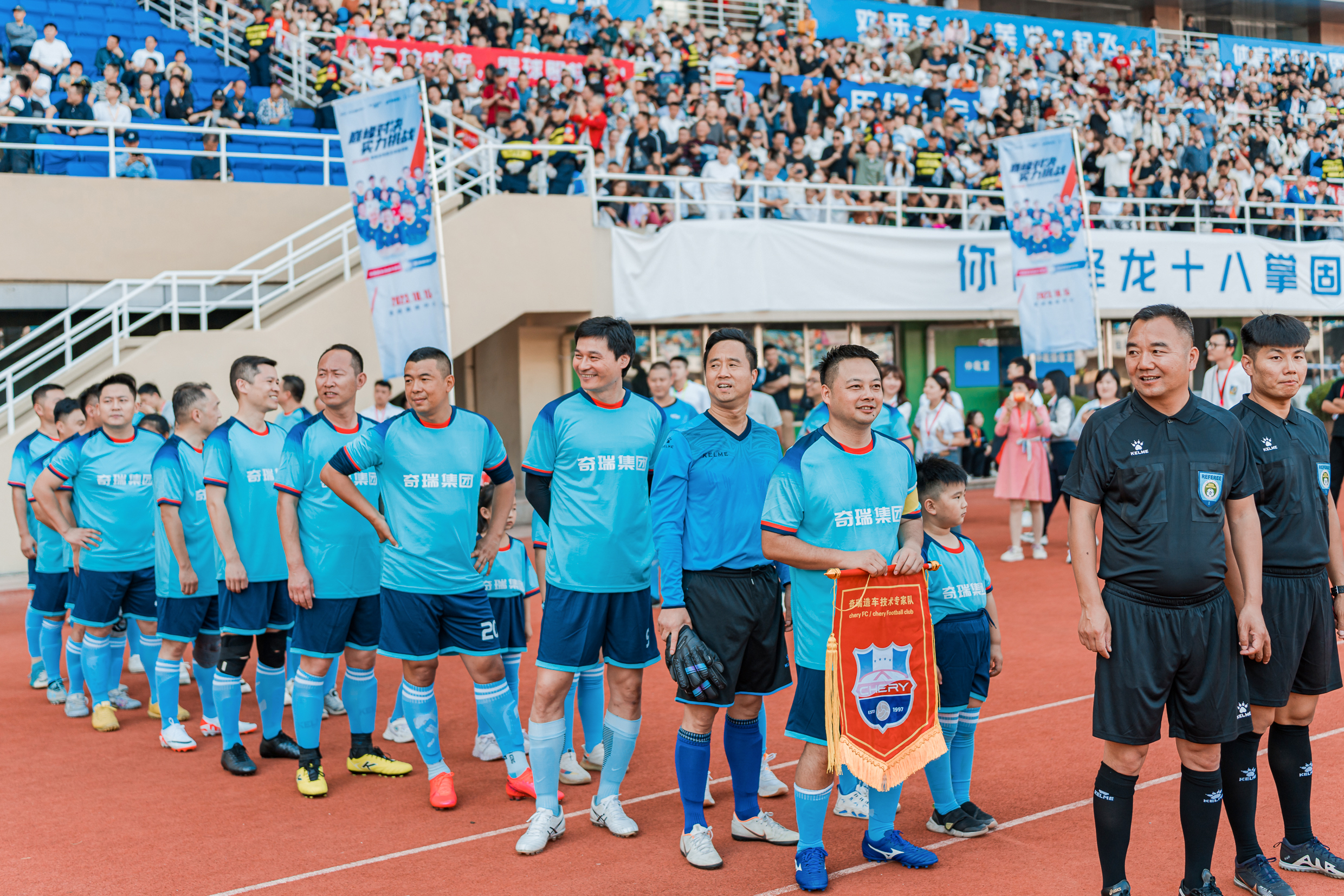 技术明星对阵影视明星,将碰撞出怎样的花火?10月15日下午,2023奇瑞全明星足球邀请赛燃情开赛,由黄日华、陈百祥、何家劲等组成的香港明星足球队做客芜湖奥体中心,与奇瑞造车技术专家队巅峰对决,为现场球迷奉献了一场精彩绝伦的对攻大战。面对强敌,奇瑞造车技术专家队凭借永不放弃的精神,在落后的情况下连扳三球,险些追平比分。最终两队战成5比4,令全场球迷大呼过瘾。